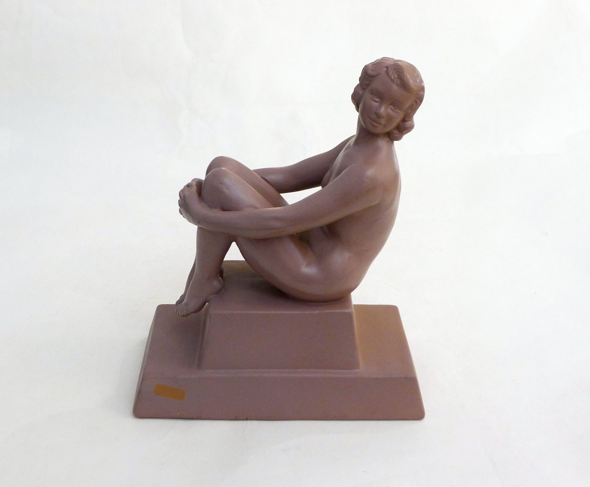 Sculpture de style Art Déco d’une baigneuse / femme nue assise ; en terre cuite peinte