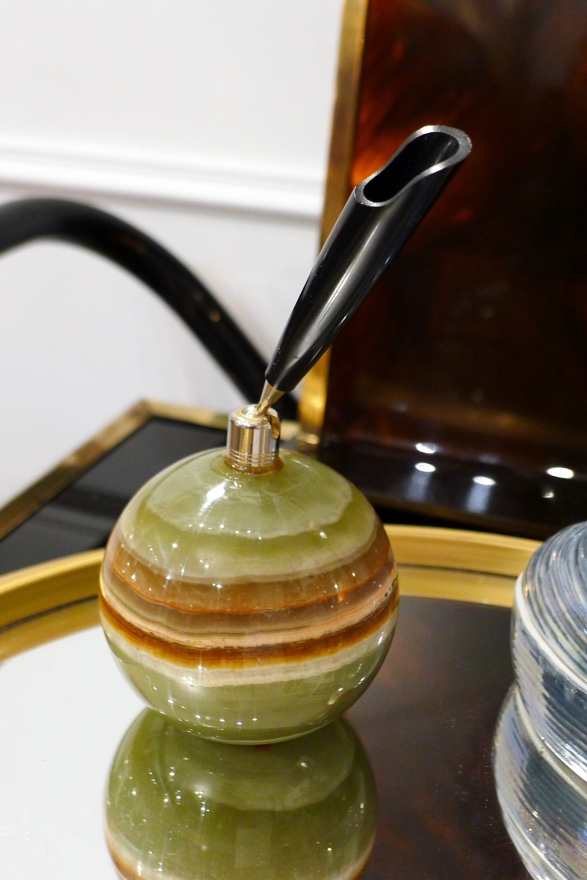 Porte-stylo individuel sur rotule, forme boule ; en onyx veiné, métal doré & plastique ; 1960′