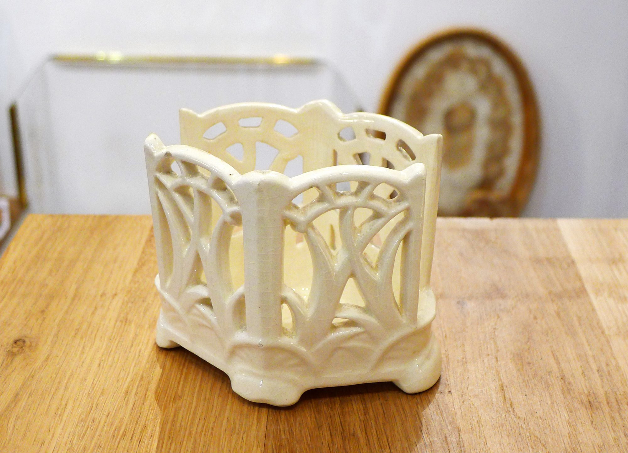 Petit pot de rangement / porte-lettres, motif néo-gothique ajouré ; en faïence crème ; début XXème