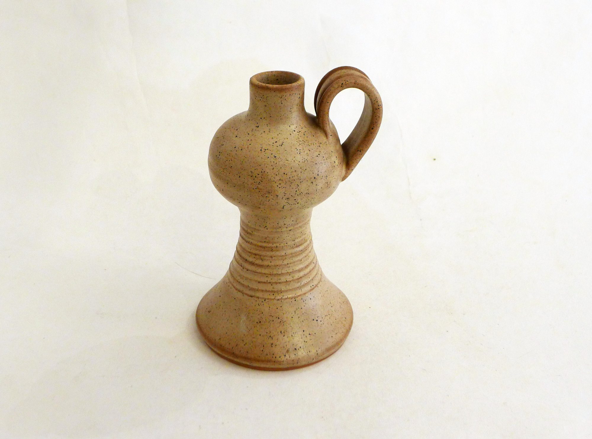 Petit pichet bouteille (ou soliflore!) Vallauris, anse ruban ; en grès mat ocre moucheté ; 1970′