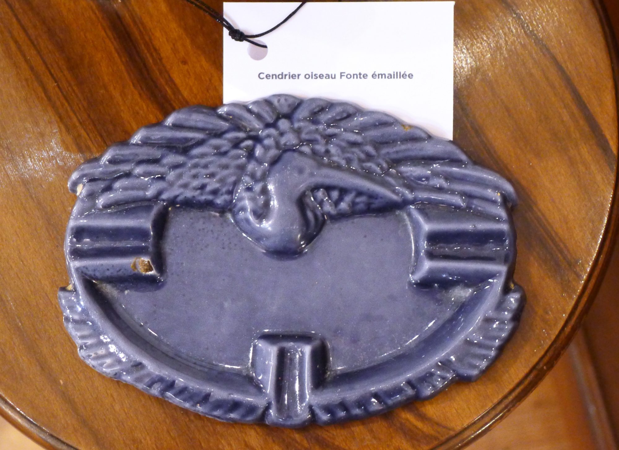 Cendrier Art Déco ovale, motif oiseau stylisé ; en fonte émaillée ; 1930′
