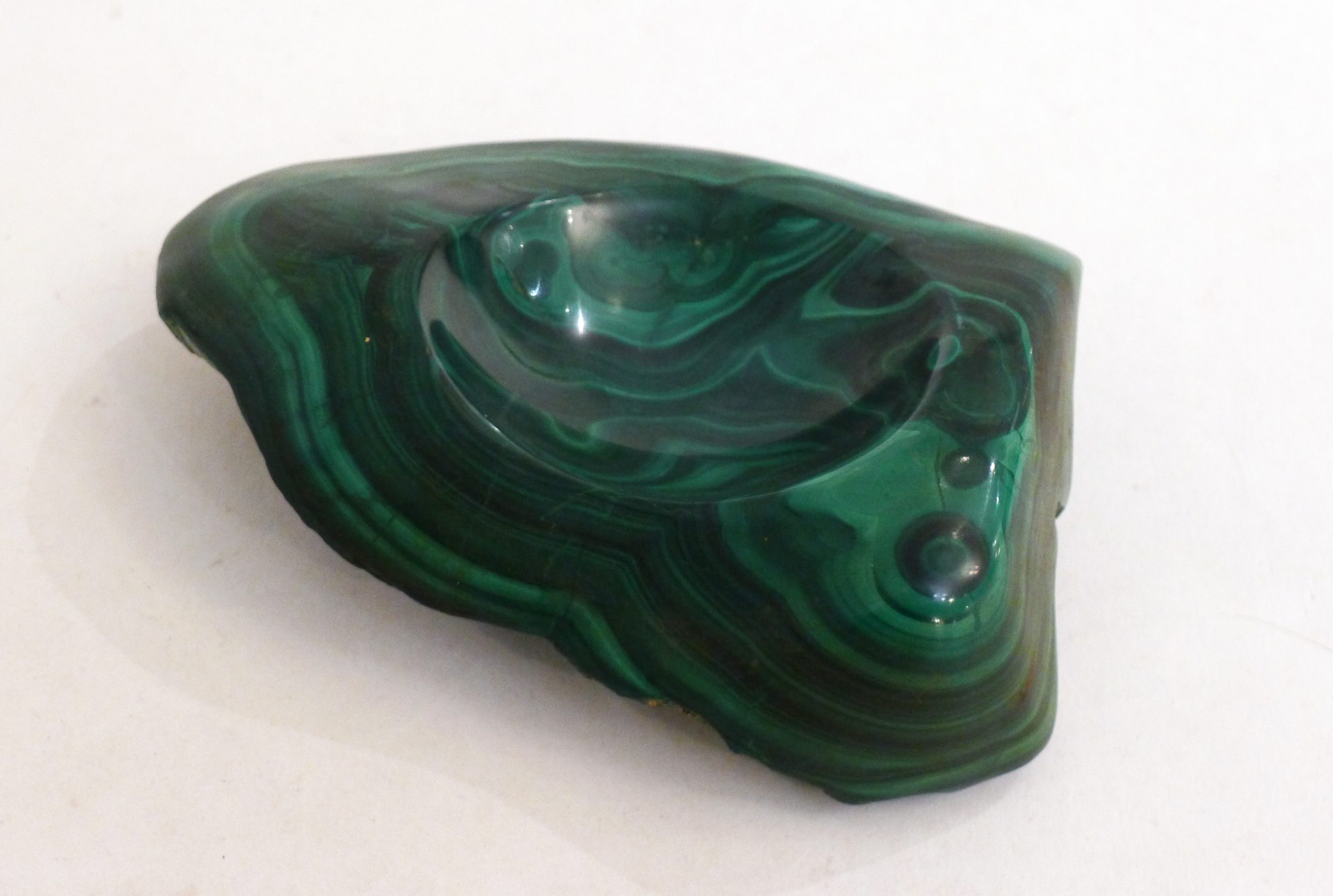 Gros cendrier bloc brut, contenant ovale ; en pierre de malachite verte veinée ; 1960′