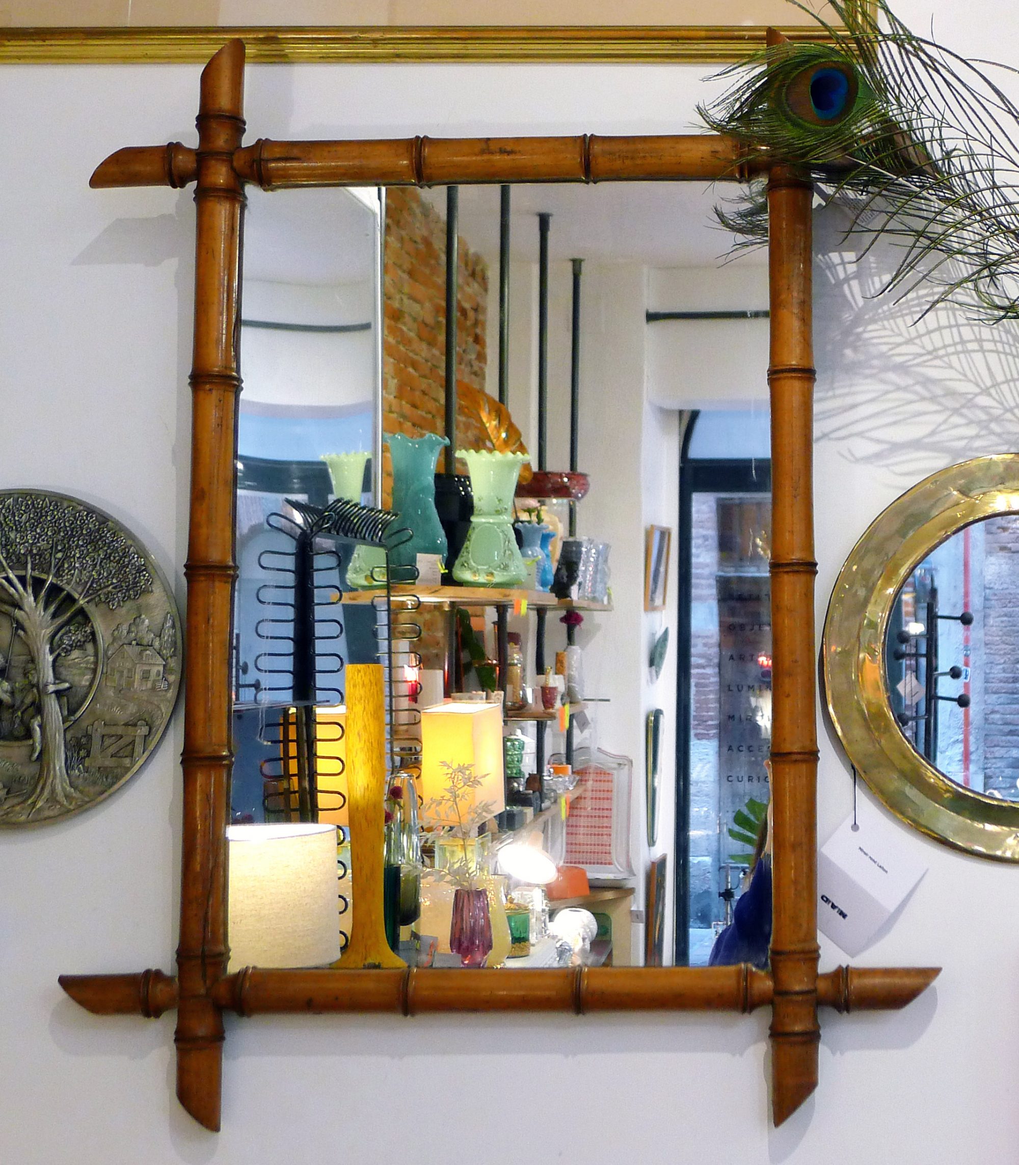 Grand miroir mural Bambou ; en bois tourné & miroir ; 1940′ / 1950′