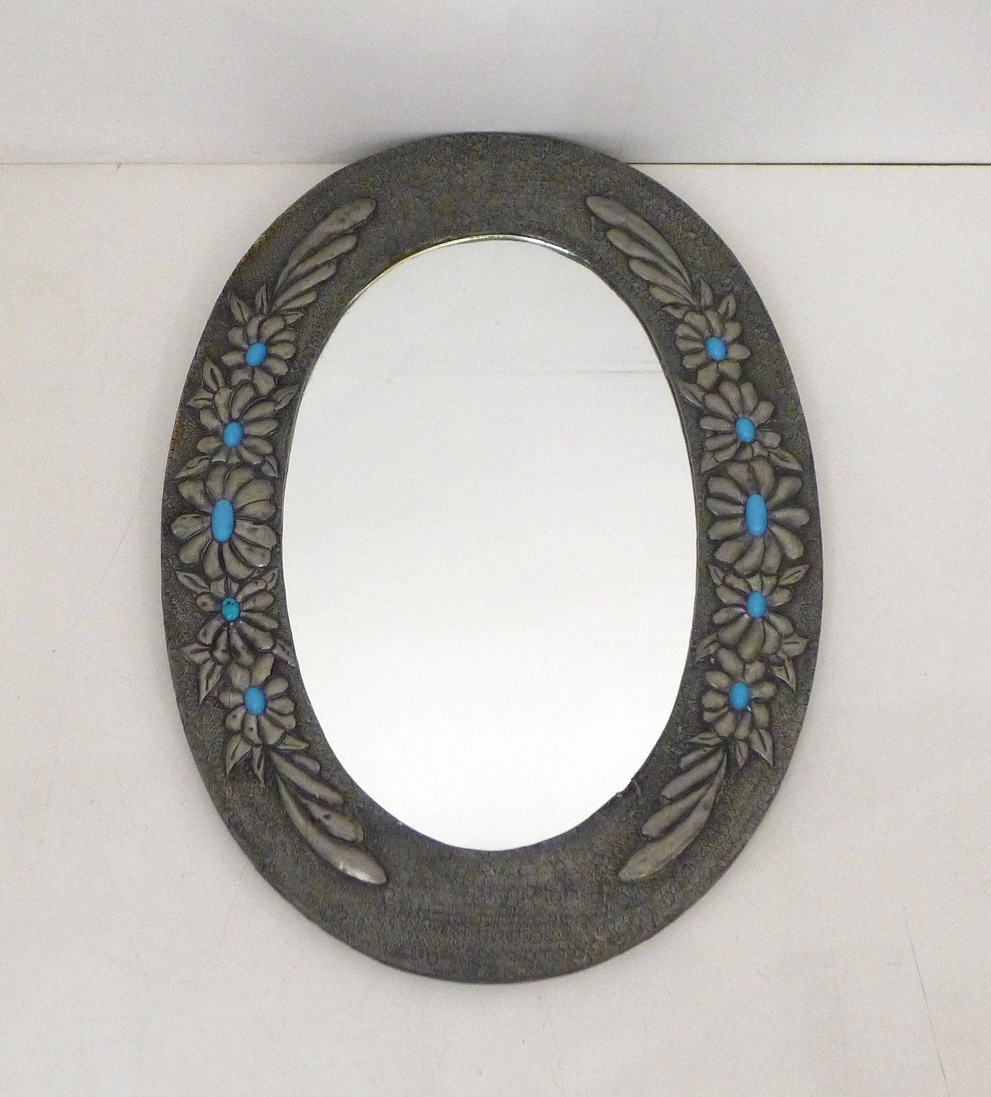 Miroir mural ovale, décor de fleurs en repoussé ; en étain, turquoise, bois & miroir ; 1950′ / 1970′