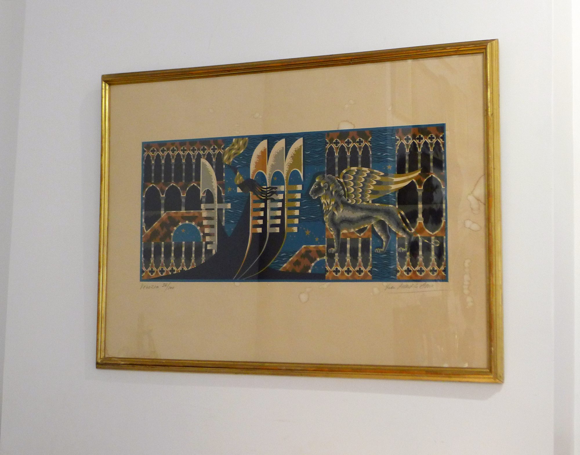 Grande lithographie encadrée « Venezia » signée J. Picart le Doux, exemplaire 36/100 ; en papier, bois doré & verre ; 1960′