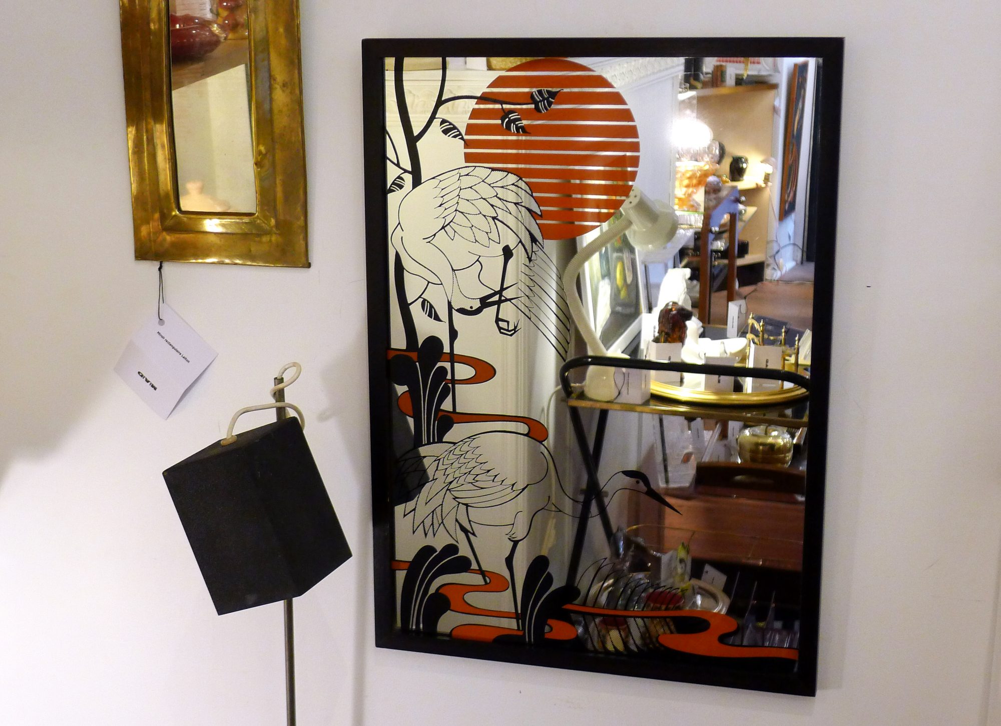 Miroir imprimé à décor japonisant de grues & coucher du soleil ; cadre bois & miroir ; 1970′ / 1980′