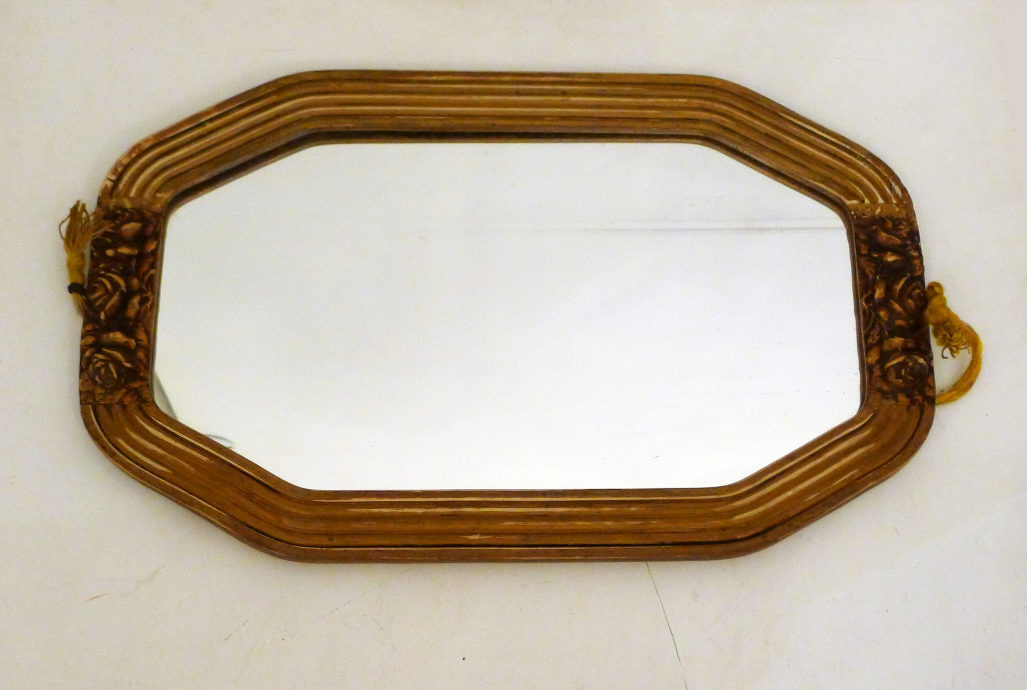 Miroir mural Art Déco, format octogonal paysage, cadre rainuré & motif floral sculpté ; en bois patiné doré ; 1930′ / 1940′