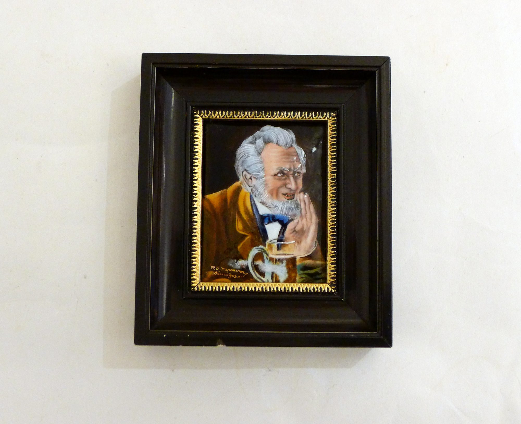 Petit tableau Homme chuchotant, signé FJ Carmona, maitre émailleur Limoges ; émail sur cuivre, cadre bois ; mi XXème
