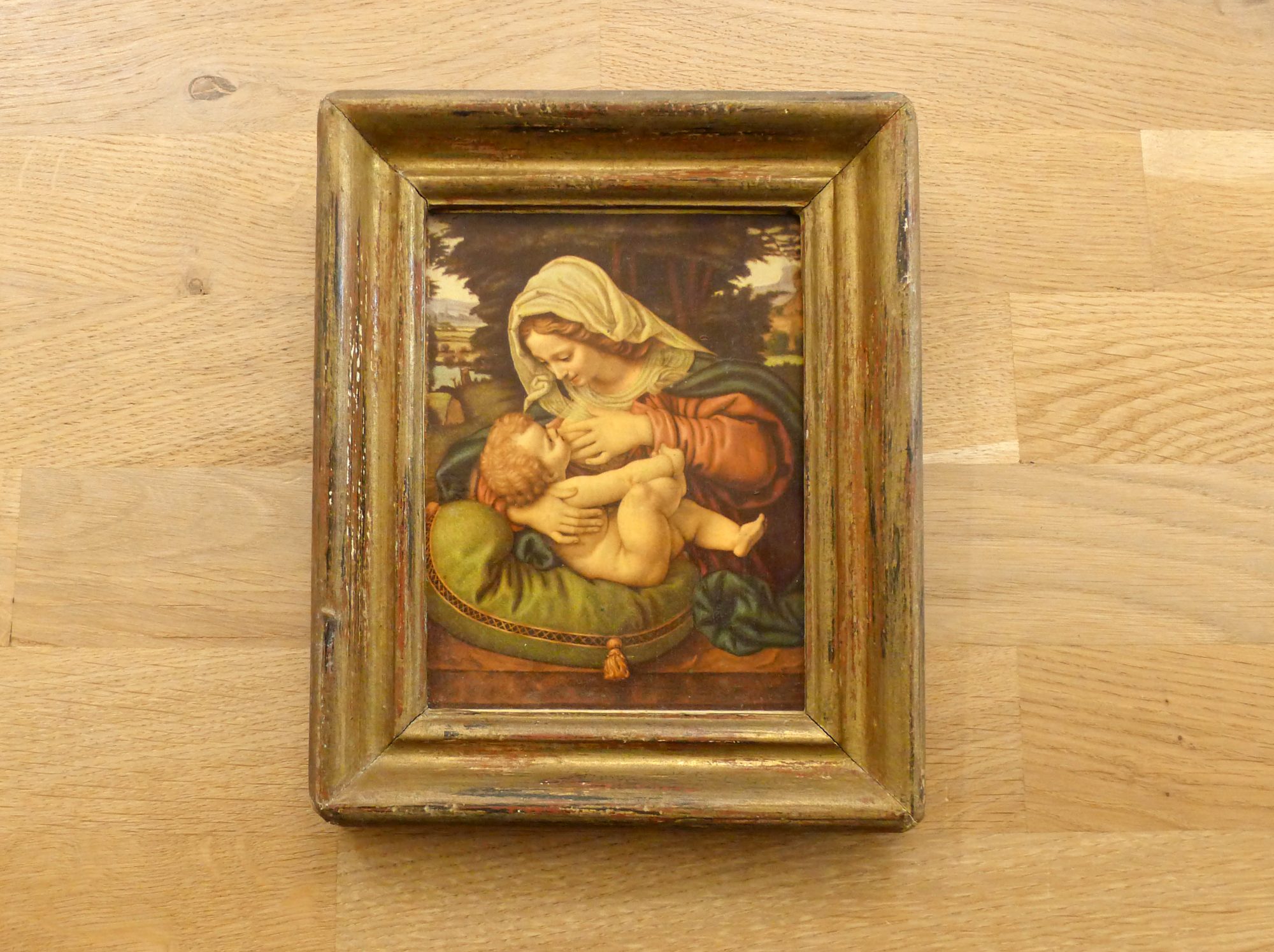 Petite repro du tableau « La Vierge au coussin vert » allaitant l’enfant Jésus (A. di Bartolo XVIème Italie) ; en bois