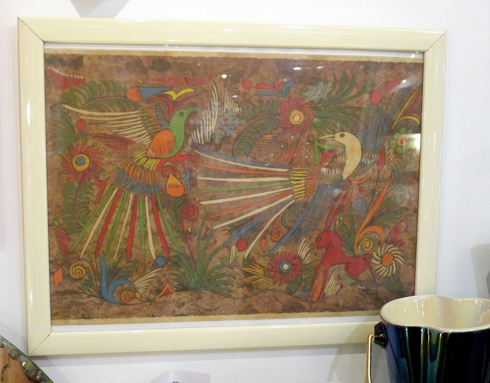 Illustration mexicaine aztèque encadrée, animaux colorés psychédéliques ; set de table, bois laqué & verre