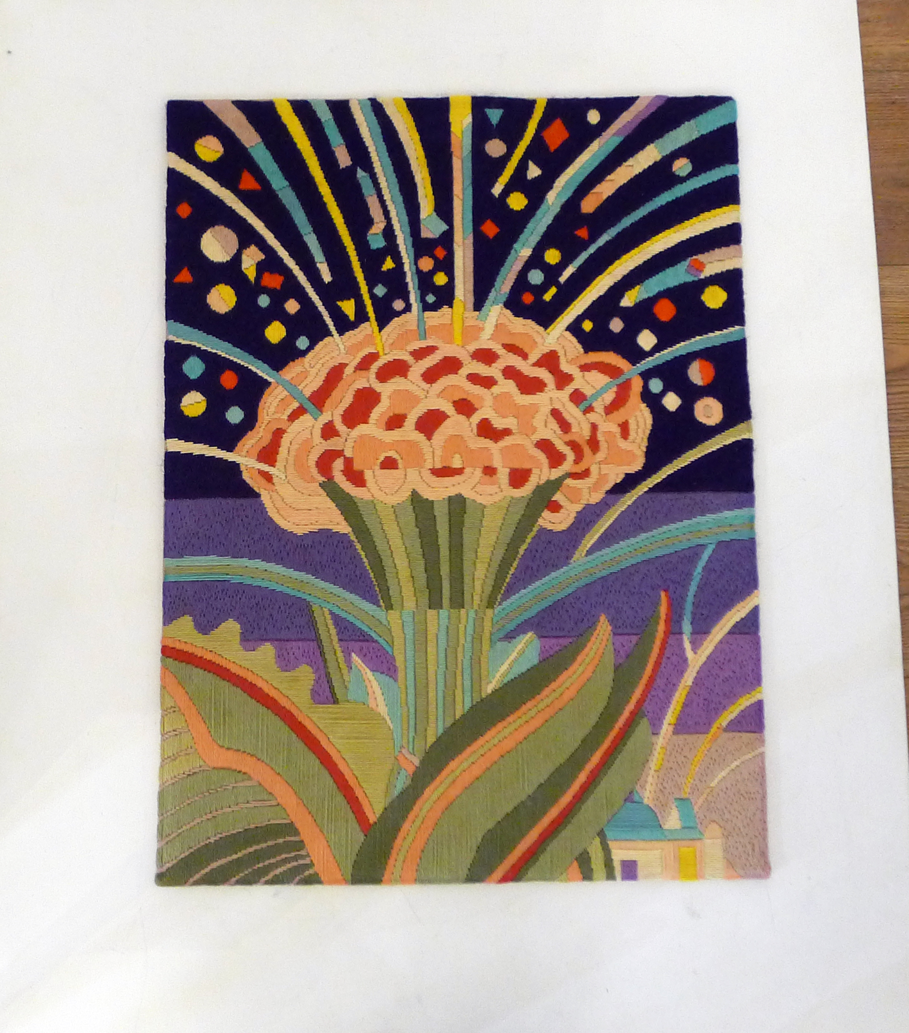 Grande tapisserie murale colorée, motif psychédélique ; fils de laine & bois ; 1970′