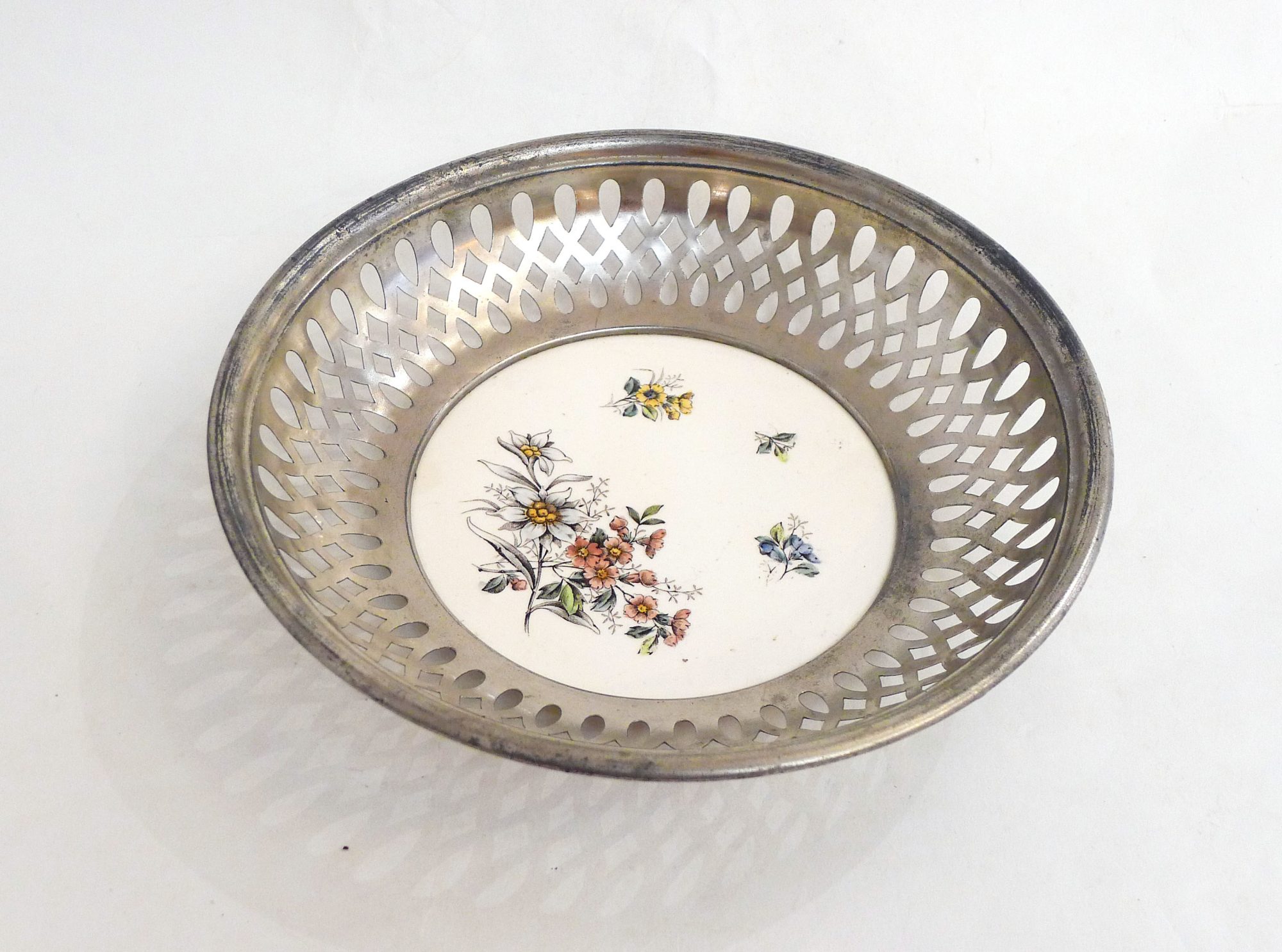 Corbeille ronde à pain ou fruits, décor fleuri & rebord ajouré, signé Max Dannhorn (Allemagne) ; en faïence & métal ; fin XIXème
