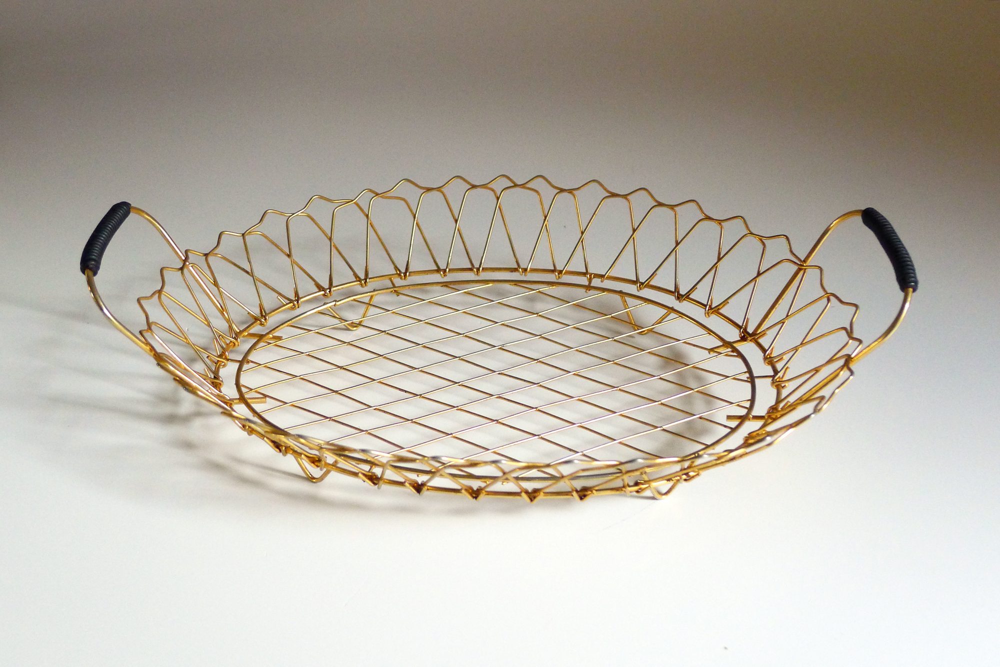 Petite corbeille ovale, structure ajourée treillis métallique, anses scoubidou noir ; en métal doré ; 1960′